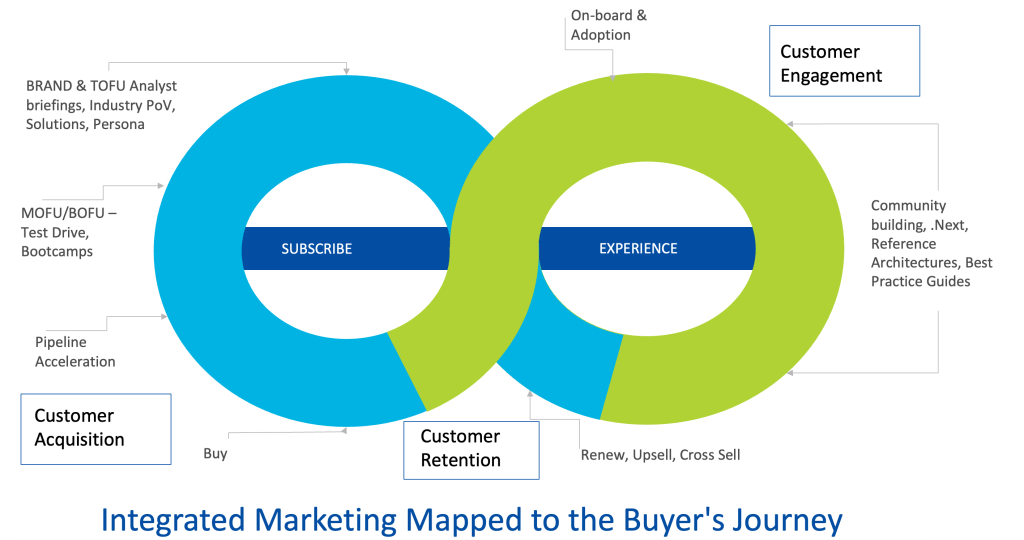 Traditionally marketing started with the top of the funnel lead generation, lead scoring, lead engagement, etc., coming down all the way to the win or loss of the deal. However, with the subscription economy, where renewals become very important to sustain and grow the business, you must manage the retention of existing customers and upsell to them.