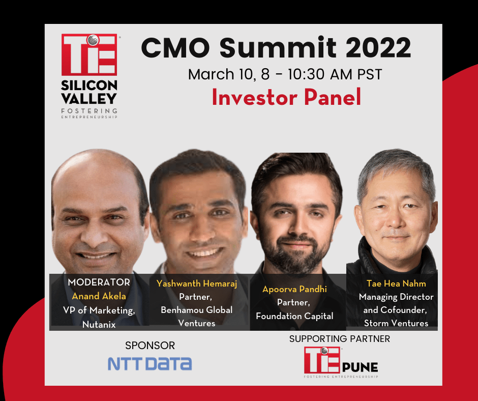 Earlier this year on March 10th, I hosted a panel discussion with leading MarTech/SalesTech/ GTM Ecosystem investors Yashwanth Hemaraj, Partner at BGV, Apoorva Pandhi, Partner at Foundation Capital, and Tae Hea Nahm, Managing Director and Cofounder of Storm Ventures at the TiE Silicon Valley CMO Summit 2022.